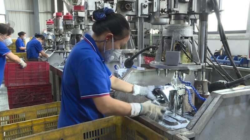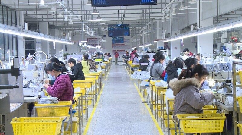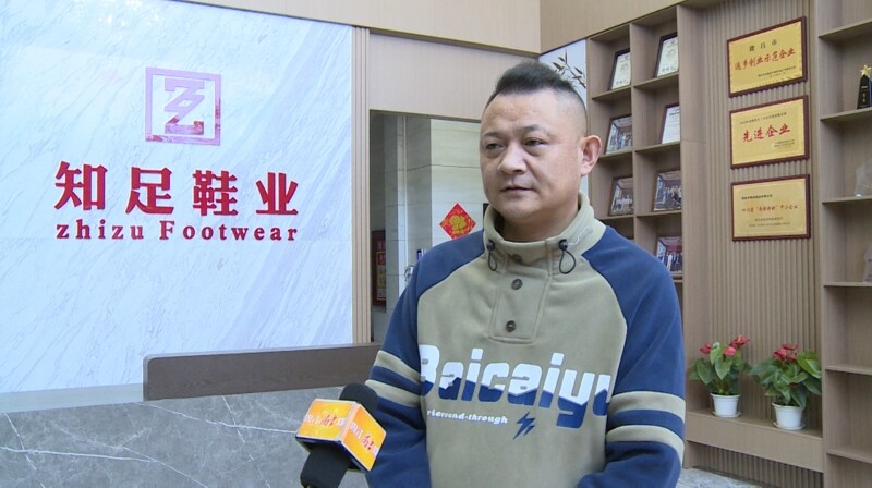 记者万丹丹介绍道:“这里是知足鞋业的生产车间,在我身后,工人们正在加紧赶制订单,而在我手中的这双鞋,从裁配到成型,要经过几十道工序组装而成,而像这样的一双鞋,在这里每天要产出近7000双,并销往全国各地。”