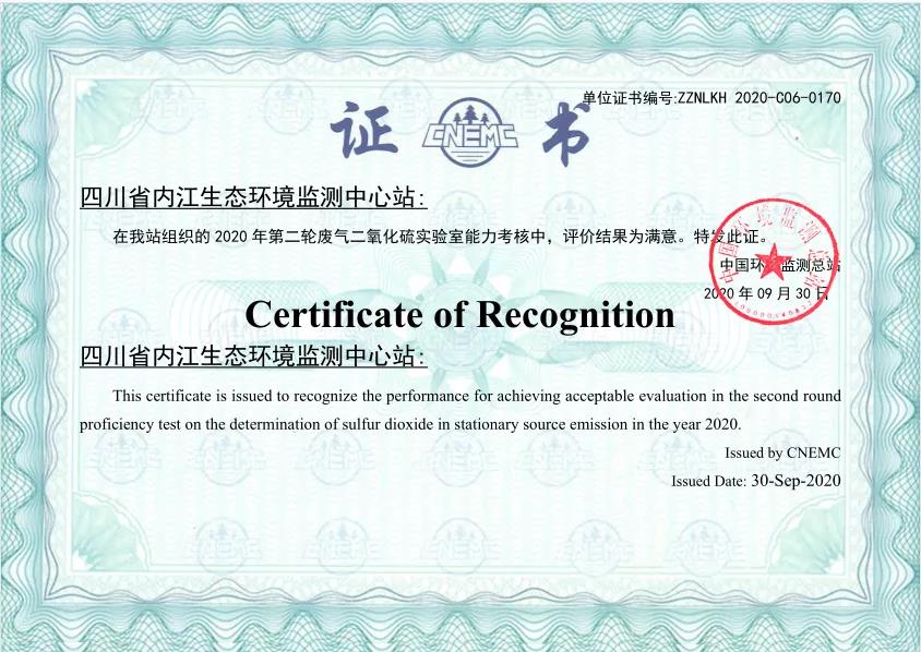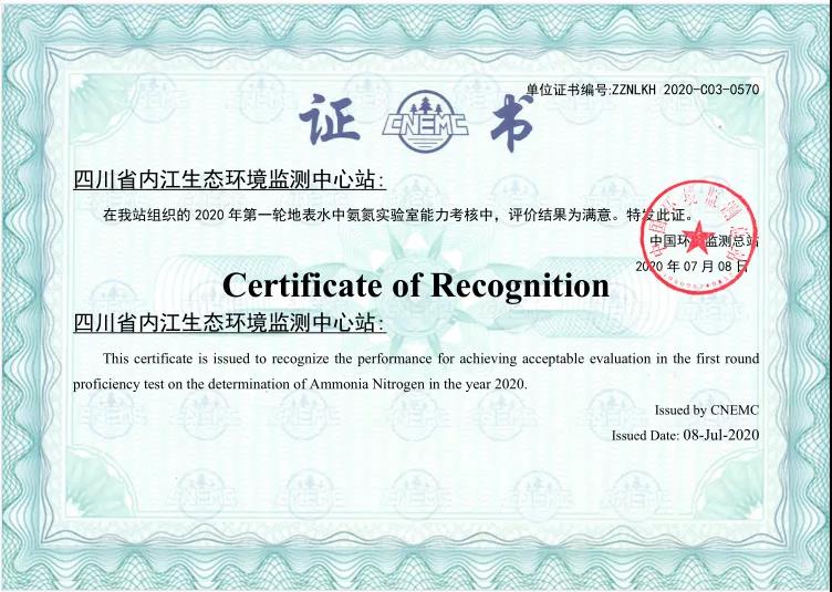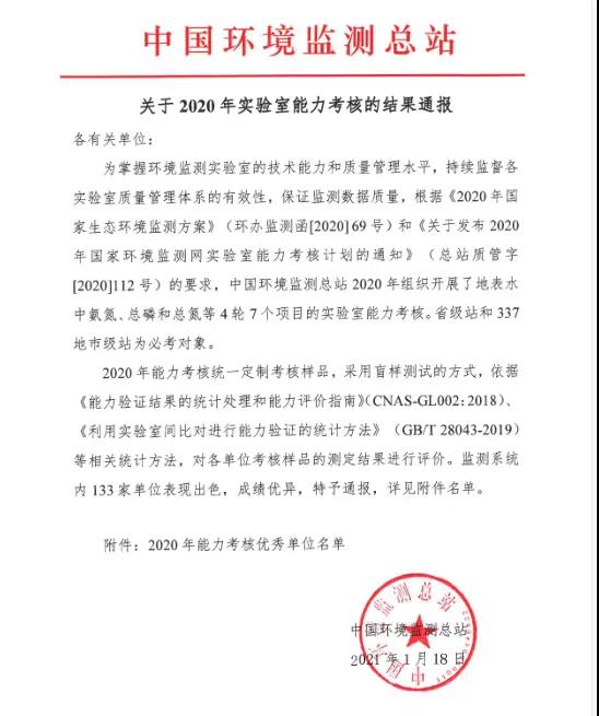 1月18日,中国环境检测总站发布2020年能力考核优秀单位名单,四川省内江生态环境监测站在中国环境监测总站组织开展的地表水中氨氮、总磷和总氮等4轮7个项目的实验室能力考核中,4轮考核结果均被评定为“满意”!被评为“2020能力考核优秀单位”。