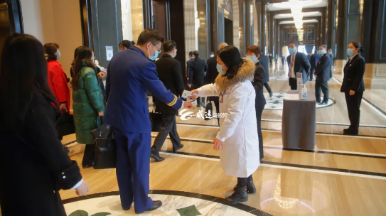 ▲委员们戴好口罩,步入会场