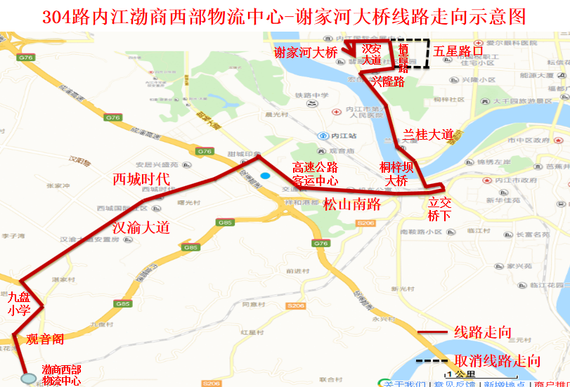 三、调整后线路走向:渤商二手车市场 —内江渤商西部物流中心—和平村—收费站—制药厂—观音阁—九盘小学— 兰家湾—汉渝大道—汉渝大道汉兴路口—汉渝大道汉祥路口—汉渝大道汉阳路口—凤凰集团—消防队—汉渝大道中段—黄家湾—高速公路客运中心—松山南路甜城大道路口—松山南路—松山南路口—兰桂大道路口—二水厂—羊子岩—栖霞路南段—汉安大道栖霞路口—谢家河大桥(原路返回)。
