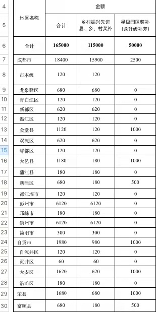 此次共下达乡村振兴先进县、乡、村奖补资金11.5亿元,星级园区奖补资金5亿元,涉及市(州)、县(市、区)两级地区共196个。其中内江市本级、内江市市中区、内江市东兴区、内江市威远县、内江市资中县、内江市隆昌市等地均有补助。