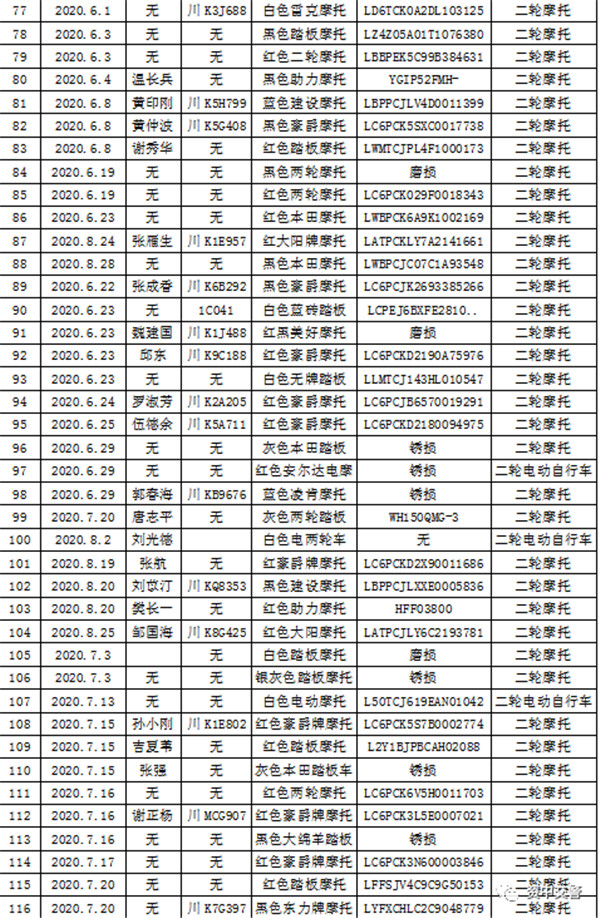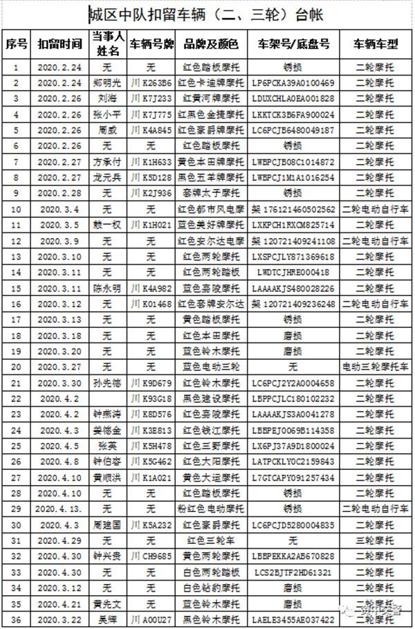 经资中县公安局交通警察大队核准,对大队下属城区中队依法扣留(收缴)的汽车13辆(轿车9辆、面包车4辆),无人领取的摩托车160辆(二轮摩托车 158辆 ,三轮摩托车2辆),二轮电动自行车20辆,电动摩托7辆,三轮电动摩托车1辆,进行公告,希各当事人(车主)自公告之日起三个月内(即2021年7月30日前),携带相关材料到资中县公安局交警大队扣留车辆的片区办理相关手续,逾期不办理的,公安机关交警部门将依法对扣留车辆依法进行强制拆解、报废处理。