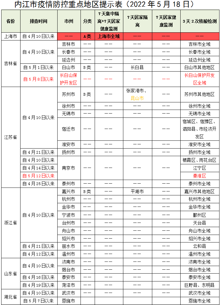 内江市疫情防控重点地区提示表(2022年5月18日)