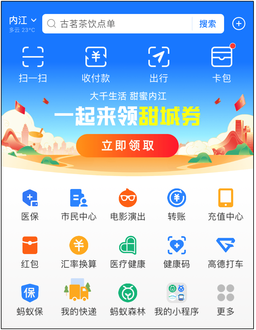 方式一:支付宝首页点击“一起来领甜城券”
