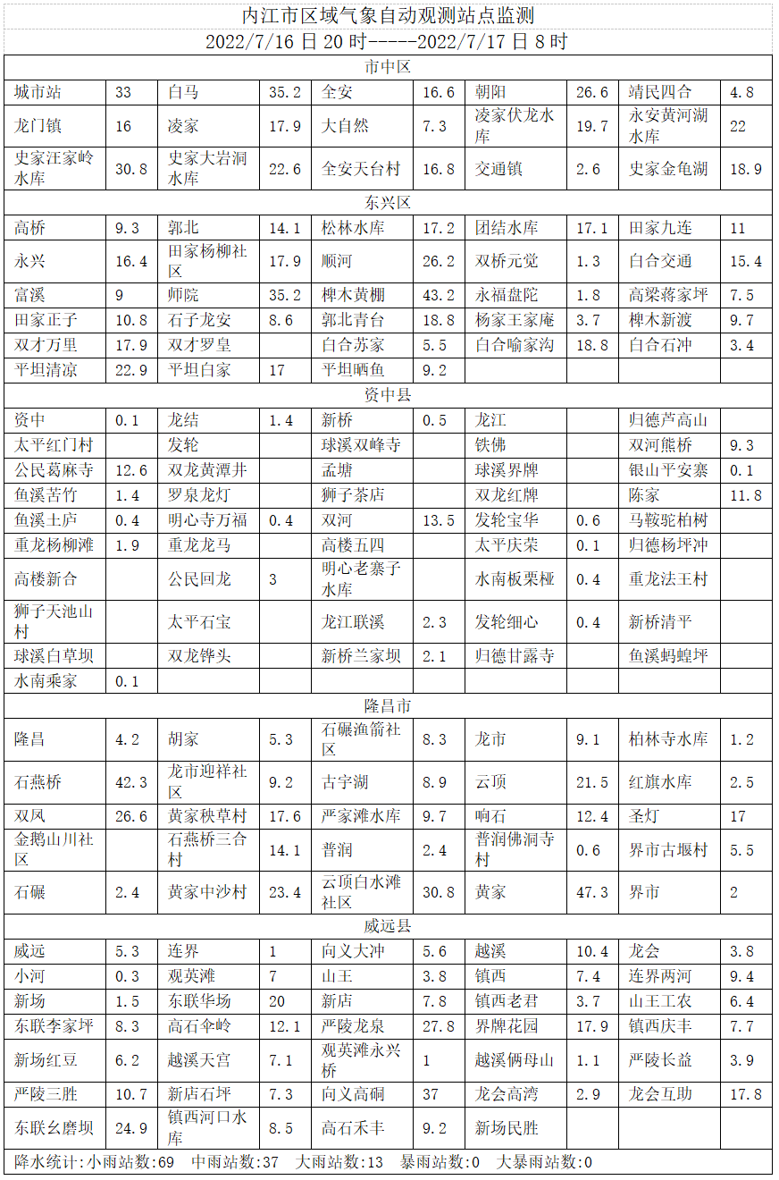 7月16日20时到17日08时:我市出现分布不均的雷阵雨天气,部分地方雨量中雨到大雨。最大降水出现在隆昌黄家,雨量为47.3毫米。全市148个观测站中, 大雨(25~50毫米)13站, 中雨(10~25毫米)37个。(具体雨量见附表)