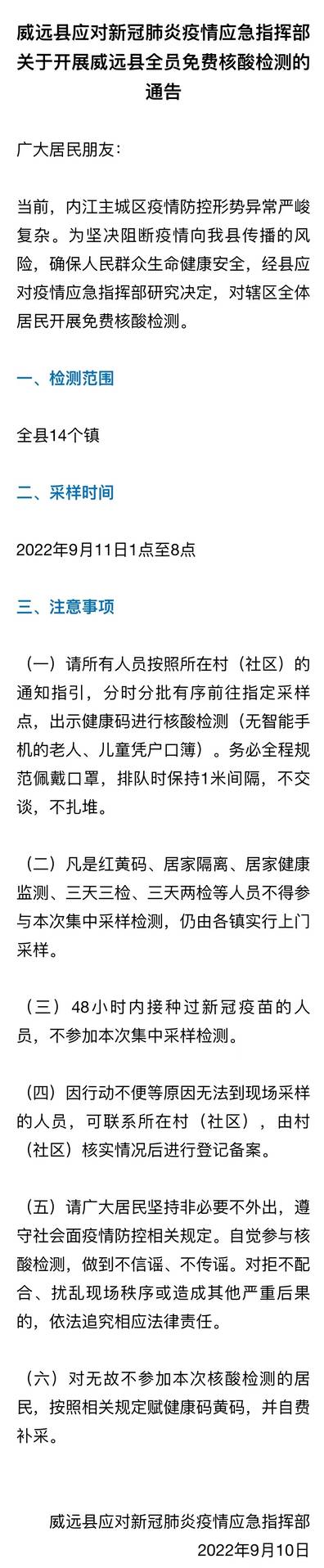 9月10日,内江威远县发布关于开展全员免费核酸检测的通告,详情如下: