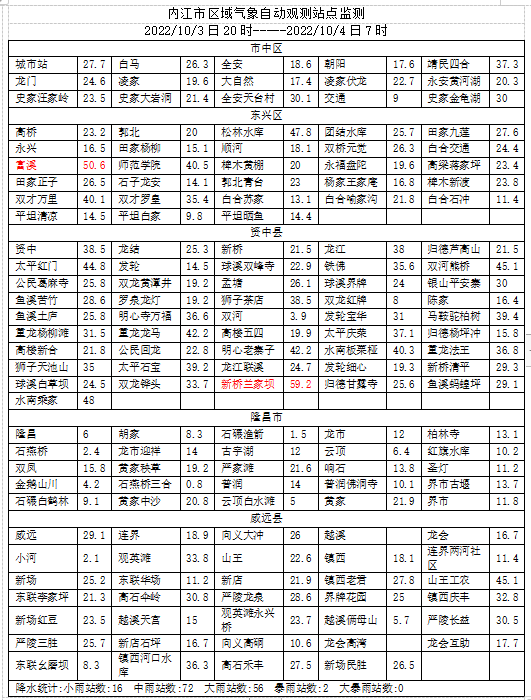 10月3日20时到4日07时,我市出现了一次雷阵雨天气过程,全市普降中雨到大雨,其中,资中县新桥兰家坝59.2毫米,东兴区富溪50.6毫米,达暴雨。全市148个观测站中,暴雨2站,大雨56站,中雨72站,小雨16站(具体雨量见附表)。最大小时降雨出现在东兴区富溪,4日2时雨量为34.5毫米。