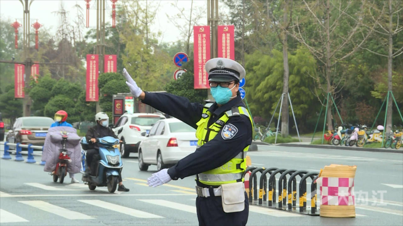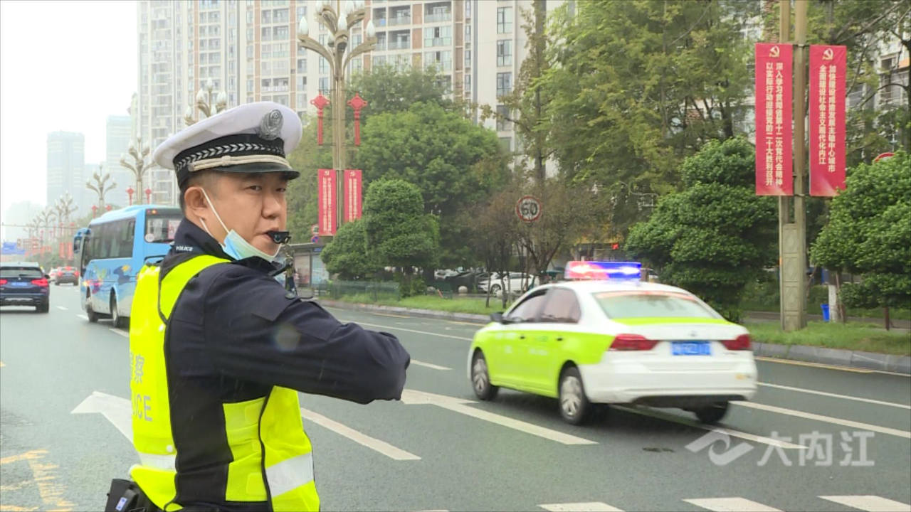 连日的小雨导致路面湿滑,在汉安大道、兰桂大道等重要路口,内江市交警支队直属二大队的交警正通过吹口哨、指挥手势等方式指挥道路交通,引导车辆有序通过,防止交通拥堵和交通事故的发生。