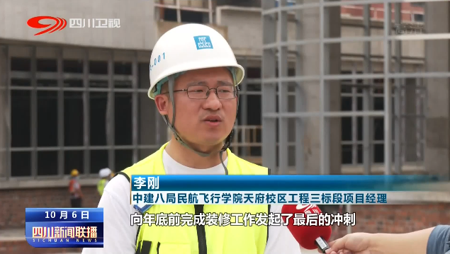 中建八局民航飞行学院天府校区工程三标段项目经理 李刚:现场作业人员共有1700多人,向年底前完成装修工作发起了最后的冲刺,整个项目预计在明年5月投入使用。