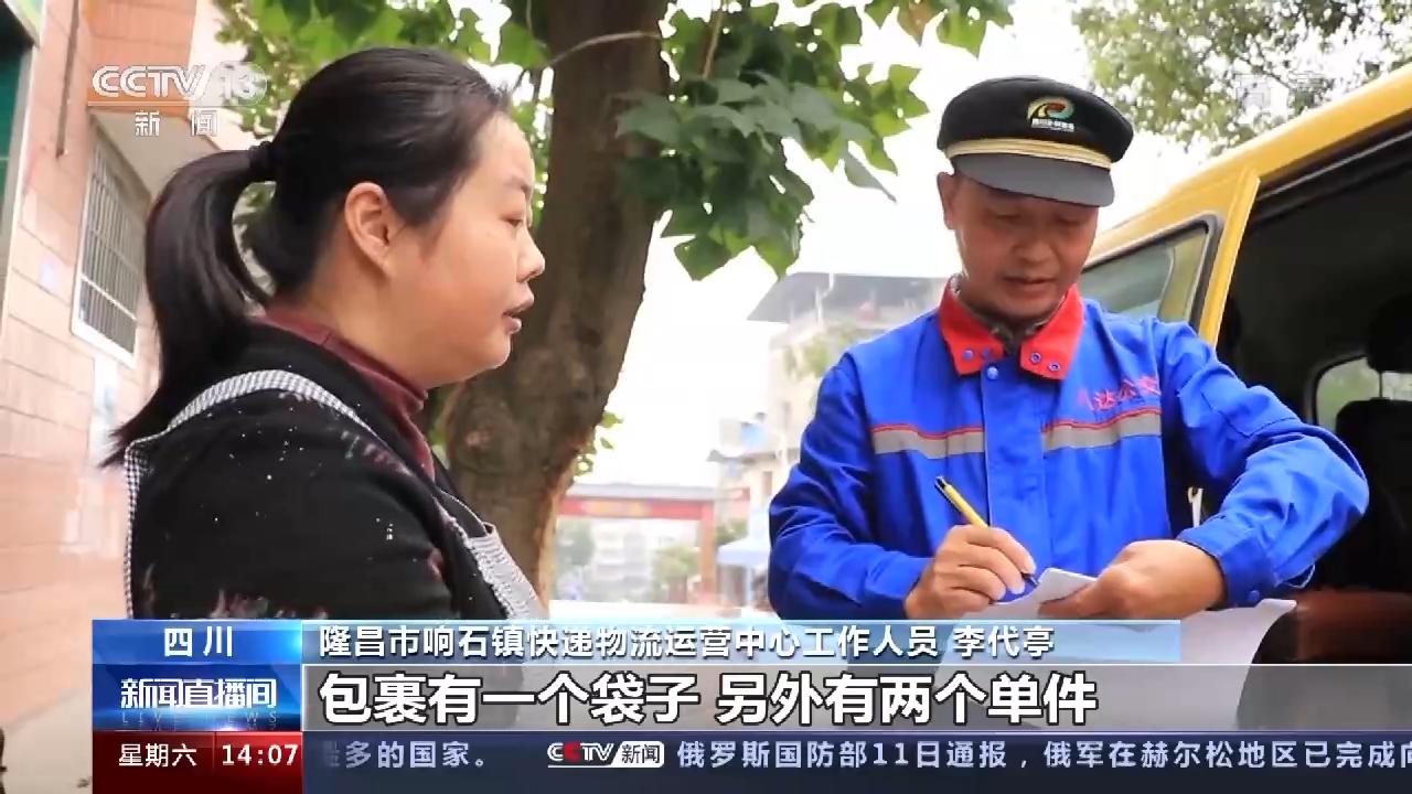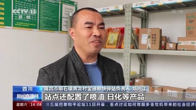 隆昌市响石镇黄龙村金通邮快驿站负责人 郑兴江:站点还配置了粮油、日化等产品,方便了老百姓日常需求。这里也可以卖村里的农特产品,顾客在网上下单,我们就可以给他邮寄过去。