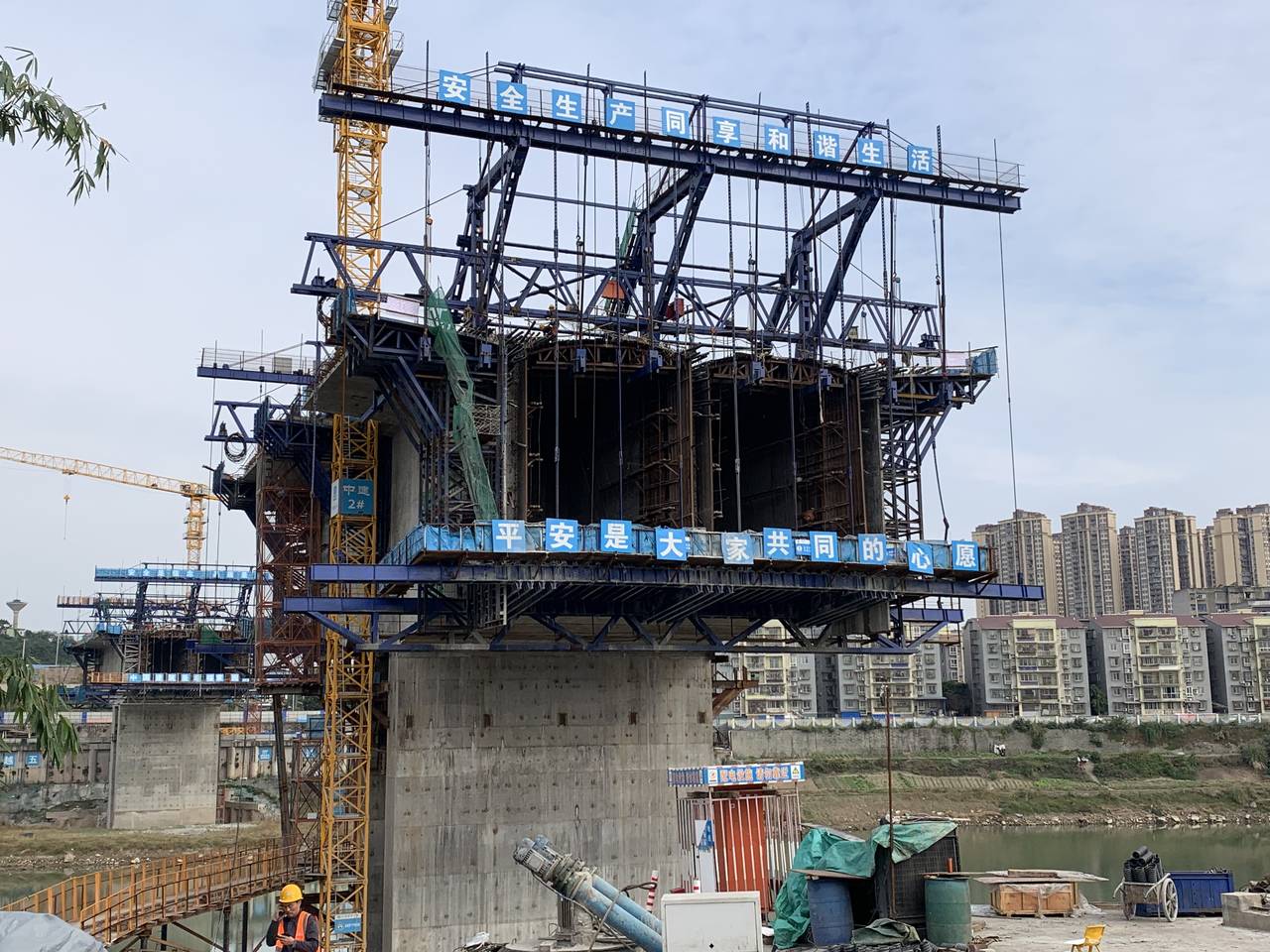 “目前,水心坝大桥已完成全部的下部结构施工,现已全部进入上部箱梁结构施工阶段,整个大桥箱梁目前已完成12个节段,平均每个月完成6个节段,其中白马岸已完成箱梁7号块施工,正在进行8号块准备;水心坝岸完成5号块,正在施工6号块。施工速度持续推进,预计明年上半年完成合龙和通车。”该项目现场负责人朱鸿宇介绍道。