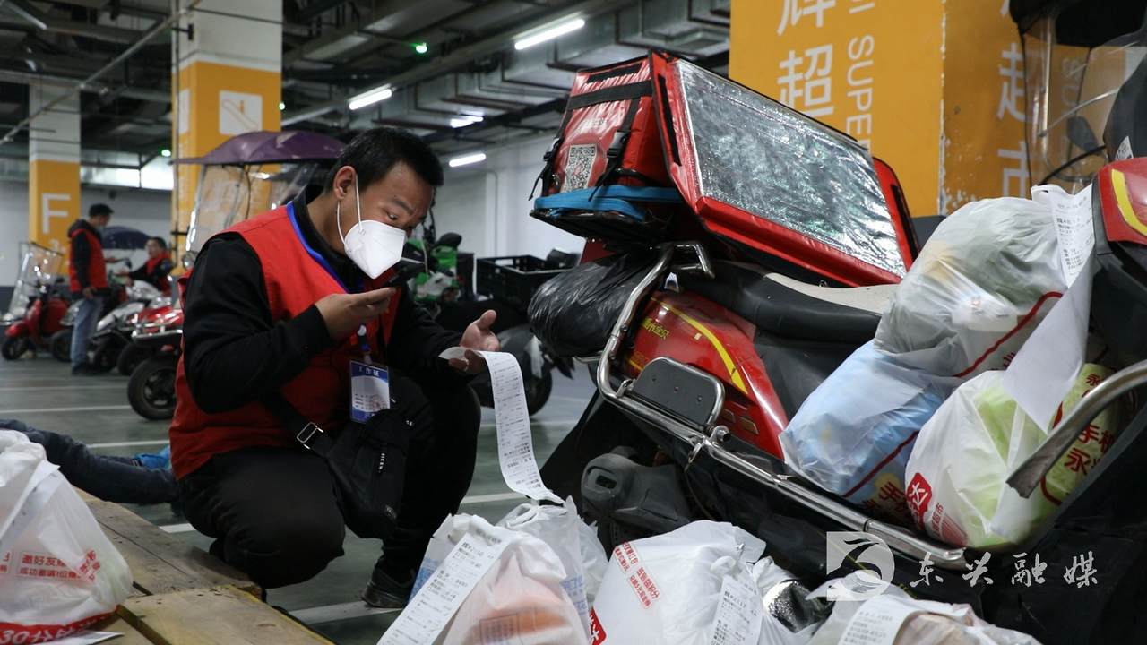 11月23日,在超市内部,工作人员在粮油、水果、副食等区域忙碌,按照从后台领取的订单将各类生活物资进行分拣、打包、装运…再由专门的配送人员消毒后送达指定小区门口。
