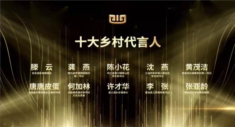 表演过程中,“100个魅力乡镇”“100名乡土文化能人”“100名乡村代言人”名单也相继出炉:内江市市中区龙门镇、威远县向义镇、内江市市中区永安镇、威远县严陵镇获评“100个魅力乡镇”;资中县孟塘镇睦邻村“第一书记”林昆、威远县省级非物质文化遗产项目“越溪牛灯舞”传承人曹根精、隆昌市圣灯镇利民土陶加工点负责人丁敬民、内江烙艺文化传播有限公司负责人王全、隆昌市响石镇传统画糖守艺人彭奎明获评“100名文化能人”;威远县文化馆舞蹈编导张亚龄、内江市东兴区郭北镇组织委员曾尹、四川汉安糖草农业科技有限公司副总经理何丽君、资中县球溪镇大象寺村“第一书记”吕丁、隆昌市石碾镇党委书记林森、内江市市中区永安镇副镇长许佳获评“100名乡村代言人”。
