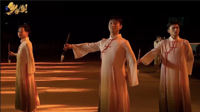 晚上7点半,展演正式开始,“阳夏”“清秋”“玄冬”“芳春”四大篇章陆续展开,以四季流转展现蜀乡故事和文化之美。内江市中区永安镇选送的8名舞蹈演员,在“阳夏”篇章出场, 他们身着长袍、手持毛笔,翩跹而来,用优美的舞姿描绘巴蜀大地壮美河山。