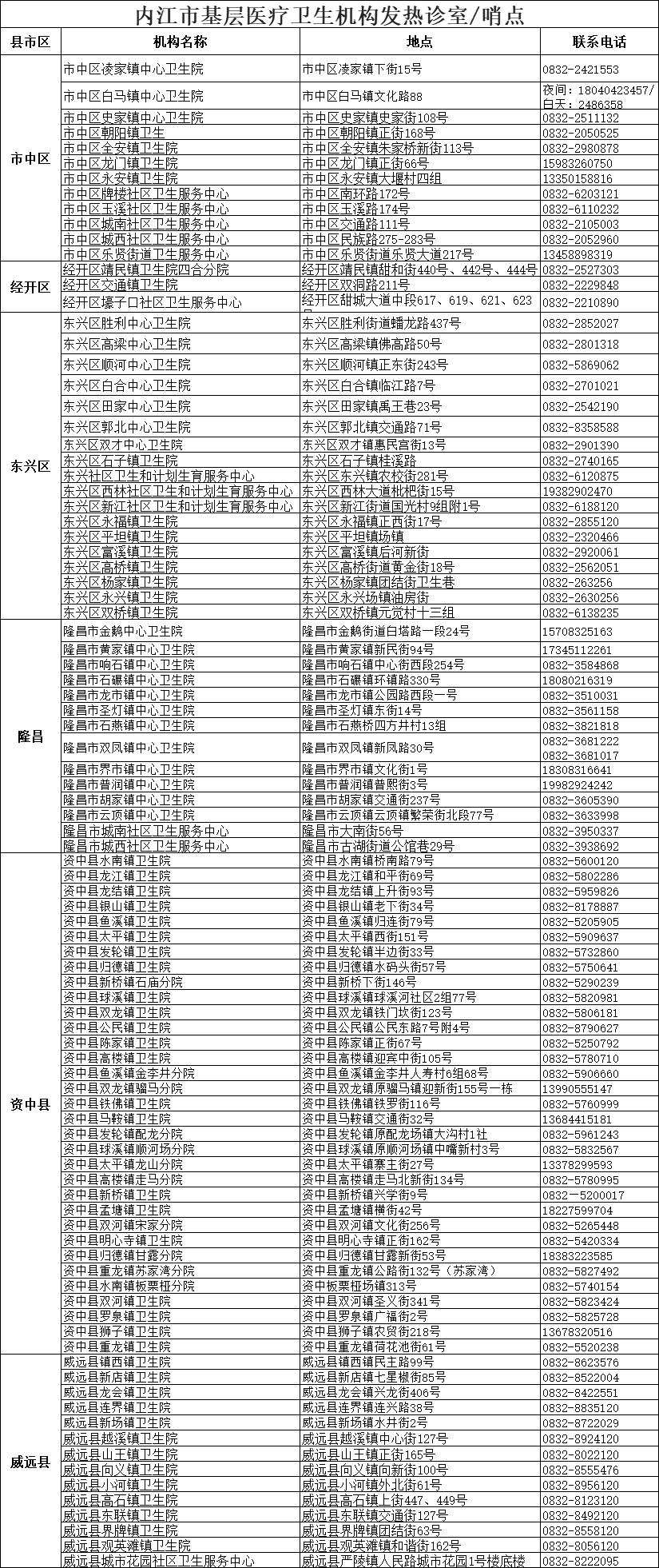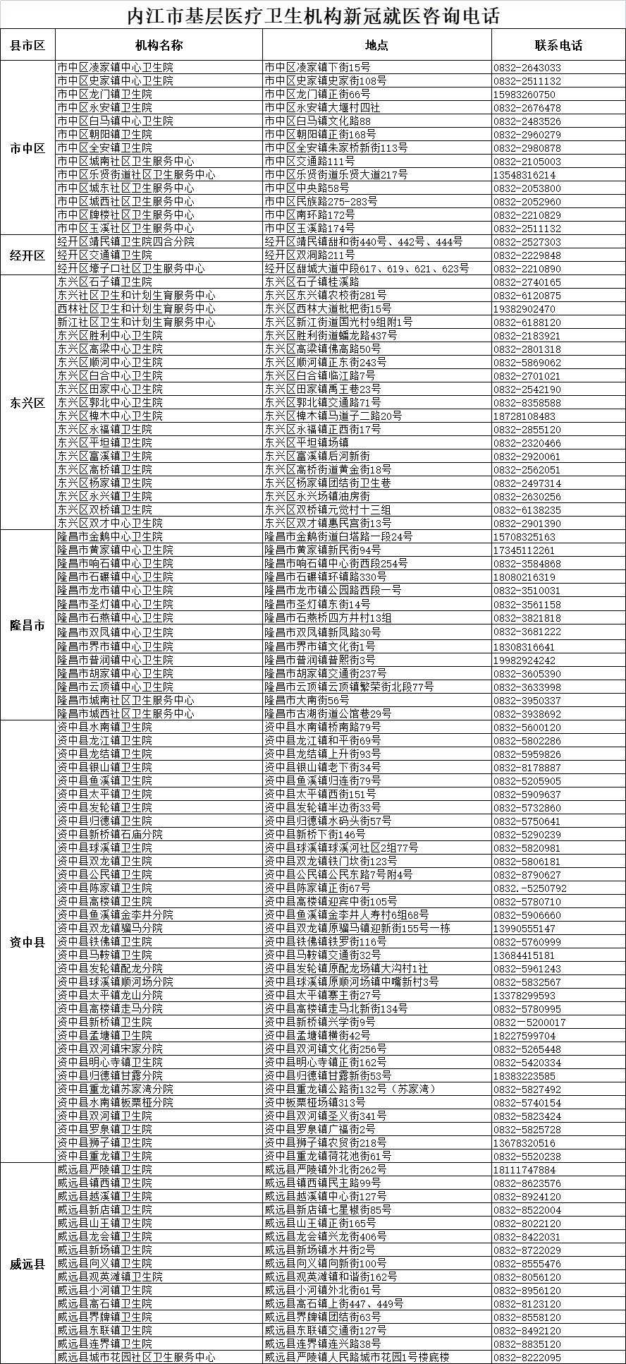 刚刚,内江公布基层医疗卫生机构新冠就医咨询电话和发热诊室/哨点,详情如下: