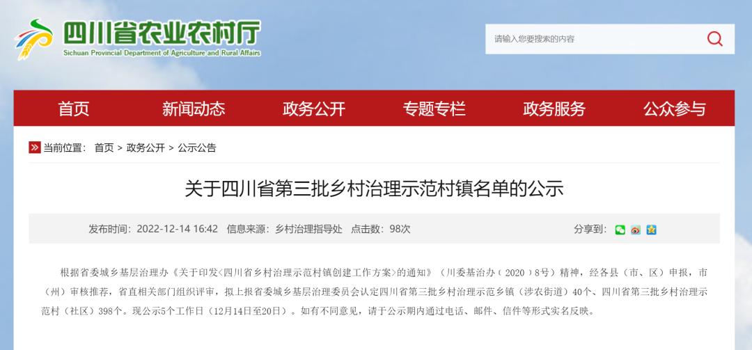 日前,四川省农业农村厅网站发布关于四川省第三批乡村治理示范村镇名单的公示。