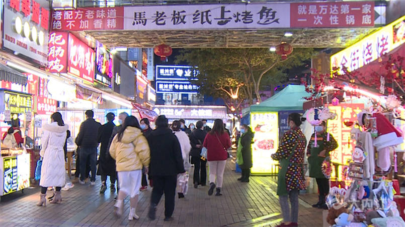 在东兴区汉安大道栖霞路口,街上的行人都佩戴着口罩。在万达金街,沿街餐饮店开门迎客,有序开放堂食,市民可自由进店就餐。同时,市民们进出万达商城也无需提供提供核酸、查验体温。
