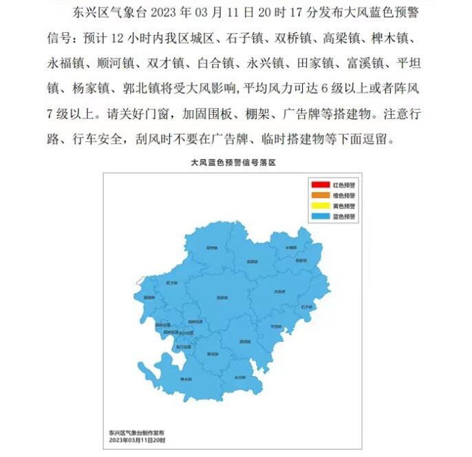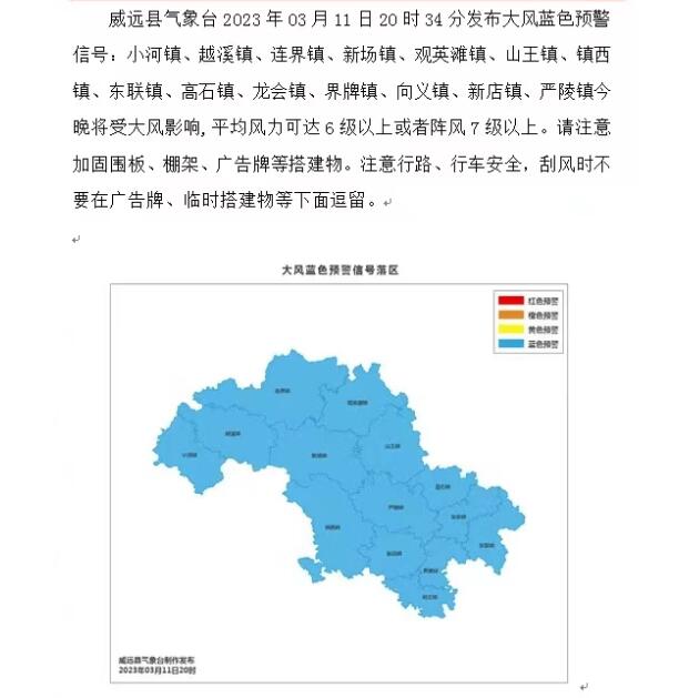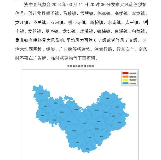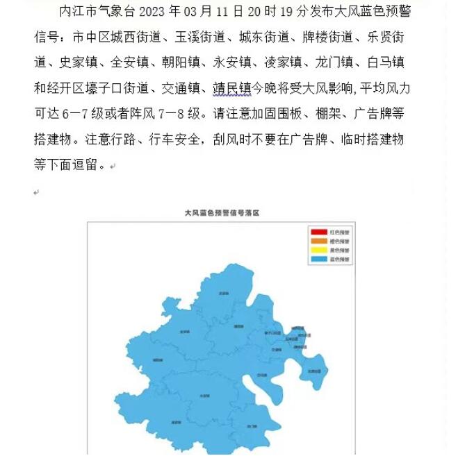 时间:2023-03-11 20:46:12 来源:内江市气象台 东兴区气象台 隆昌市气象台 资中县气象台 威远县气象台刚刚,内江多地发布大风蓝色预警信号,详情如下: