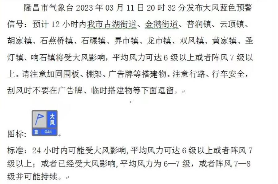 刚刚,内江多地发布大风蓝色预警信号!