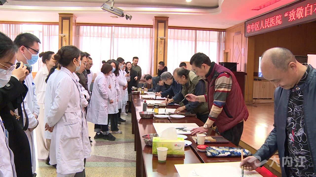 时间:2023-03-22 09:16:06 来源:内江广播电视台为进一步提高医护工作者人文素养,丰富其文化生活,3月21日,由市中区委宣传部、区委老干局、区文联联合主办的“致敬白衣天使 翰墨飘香传情”书画活动走进市中区人民医院。书画家们现场挥毫泼墨,以书言志、以画寄情,创作出一幅幅主题鲜明、格调高雅的书画作品,吸引了众多参加活动的医护工作者学习围观。这些以“医者仁心”“大医精诚”等为主题创作的书法作品和腊梅、墨竹等国画,每一幅都承载着对医务工作者的深深敬意和祝福。