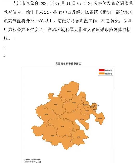 时间:2023-07-11 10:02:15 来源:内江市气象台 新华社内江市气象台2023年07月11日09时23分继续发布高温橙色预警信号:预计未来24小时市中区及经开区各镇(街道)部分地方最高气温将升至38℃以上。请做好防暑降温工作,注意防火,保障电力和公共卫生安全;高温环境和露天作业人员应采取防暑降温措施。