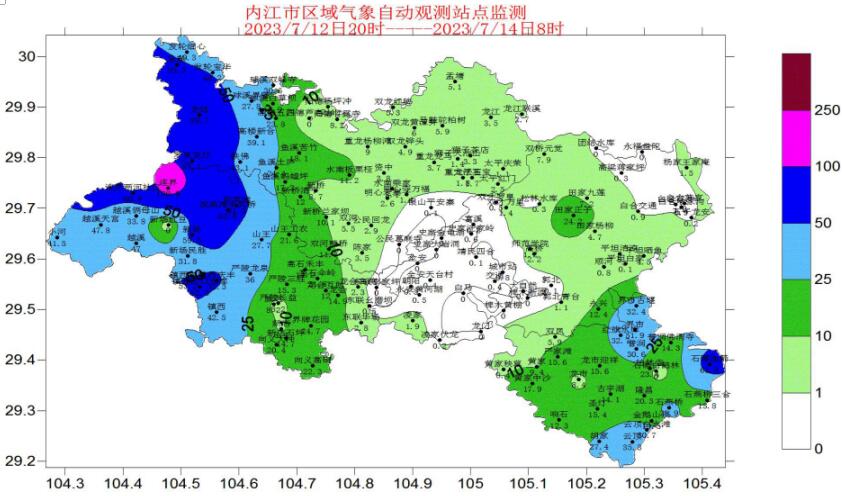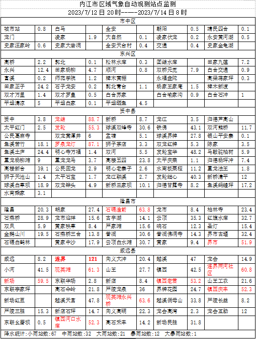 受冷空气影响,7月12日20时至14日08时,我市出现了一次分散不均的降雨天气过程,威远县、隆昌市及资中县的西部出现了中雨到大雨,局部地方暴雨,个别地方大暴雨。全市148个观测站中100-150毫米1个,50-100毫米12个,25-50毫米21个,10-25毫米32个,0-10毫米67个。最大降水出现在威远连界,累计降雨为120.9毫米(见附表)。