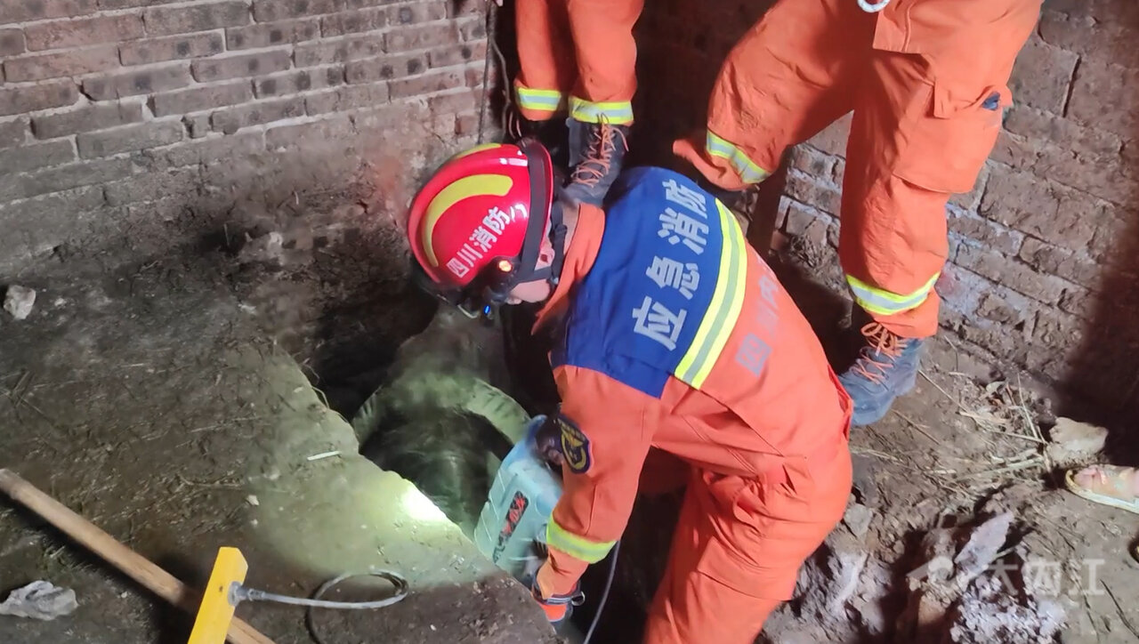 根据现场情况,消防救援人员决定先使用救援工具将坑内直径扩大。随后,消防救援人员在尝试将水牛拉出坑道时发现,水牛腿部已经麻木,无法自行站立起来。消防人员在往坑内灌水,试图用水的浮力让水牛恢复一些活力的同时,搭建起三角支架,在水牛的身上绑好绳索,利用消防车发动牵引力将水牛往上提起。过程中,消防救援人员不断“勉励”水牛,共同“渡过难关”。