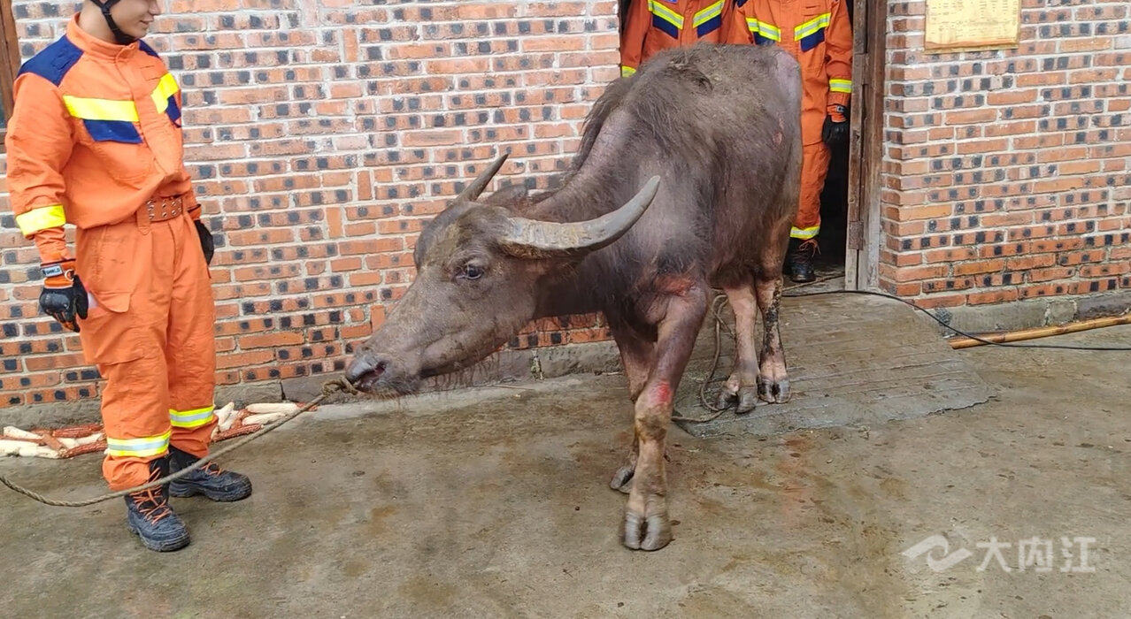 800斤水牛掉坑里 消防助其脱困