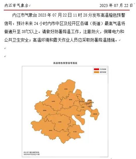 内江市气象台2023年07月22日10时17分发布高温短时临近天气预报:预计今日午后我市各县(市、区)大部地方最高气温可达37℃,部分地方将超过38℃,请做好防暑降温工作,注意防火,保障电力和公共卫生安全;高温环境和露天作业人员应采取防暑降温措施。