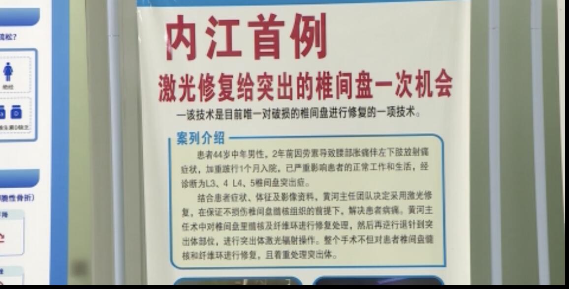 脊柱骨一科主任黄河表示:“我们脊柱骨一科两年前通过一个渠道,引进了激光机器人椎间盘脊椎修复手术,之前我们的椎间盘手术都只能通过损坏或者摘除来进行手术,而现在通过这个激光手术,能够使患者的椎间盘得到一个很好的修复,达到生理功能。”