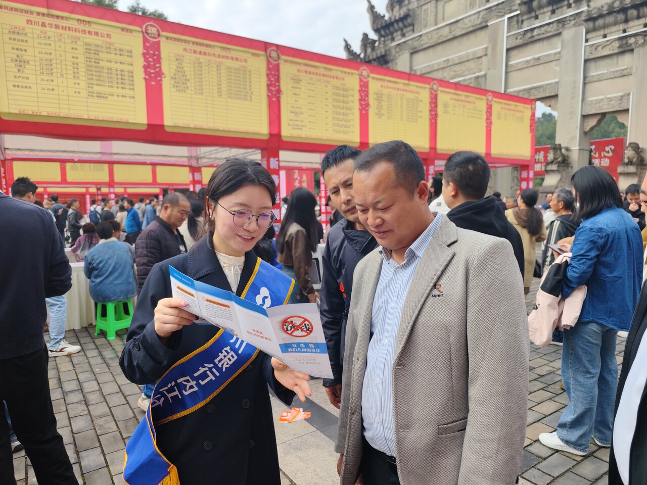本次 “春风行动” 吸引了大量求职者和用工单位参与。四川银行内江分行抓住这一契机,在活动现场设置专门的金融宣传区,通过悬挂宣传横幅、发放宣传折页、一对一讲解等多种形式,重点围绕防范电信网络诈骗、一次性信用修复政策、银行卡安全使用、存款保险知识等内容开展宣教。