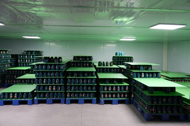 记者万丹丹介绍道,“我现在是在四川壬闰甲包装制品集团有限公司的烤花车间,在我身后,工人们正在对烤制出来的酒瓶进行最后一道工序的检验和打包,像这样的产品,一条线日产量能够达到4万只。”