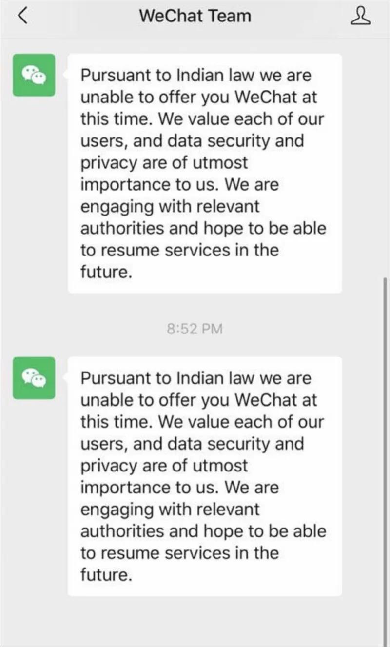 记者从可靠渠道获悉,微信在给用户的通知中称,“根据印度的相关法律,我们目前无法为印度用户提供WeChat服务。我们重视每一位用户,数据安全和隐私对我们来说是最重要的。我们正在与相关部门接触,希望未来能够恢复服务。”