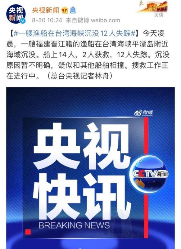 据央视新闻消息,今天(30日)凌晨,一艘福建晋江籍的渔船在台湾海峡平潭岛附近海域沉没。记者从现场救援人员获得消息。船上14人,2人获救,12人失踪。