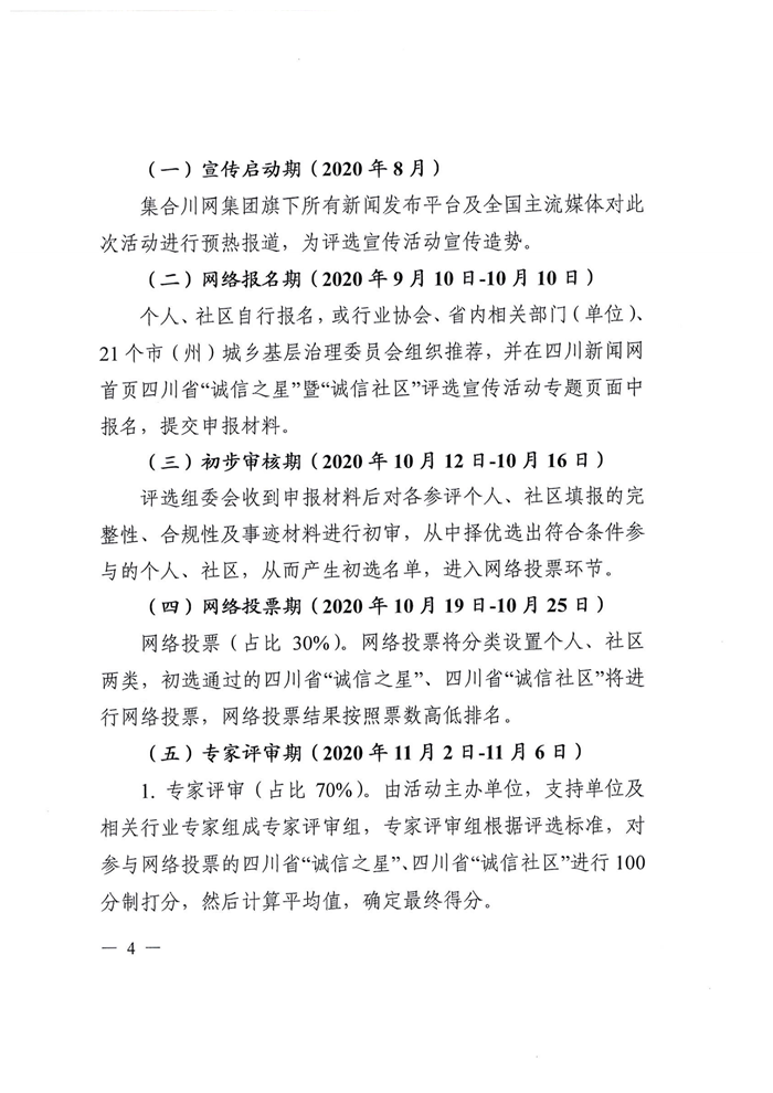 “诚信之星”暨“诚信社区”评选标准由主办单位、支持单位以及行业组织、专家根据四川省社会信用体系建设的相关标准和要求制定,专家评审组根据评选标准对参与网络投票的四川省“诚信之星”、四川省“诚信社区”进行打分。按照网络投票占比30%+专家评审占比70%的评分原则综合两项得分,按得分高低选出200名四川省“诚信之星”、200个四川省“诚信社区”,并在网上公示。活动主办单位、支持单位将对最终获评四川省“诚信之星”、四川省“诚信社区”的个人、社区进行联合授牌,并组织省内主流媒体进行持续重点宣传。