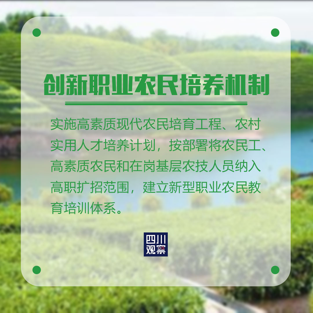 (三十五)创新职业农民培养机制。实施高素质现代农民培育工程、农村实用人才培养计划。按部署将农民工、高素质农民和在岗基层农技人员纳入高职扩招范围。积极办好职业院校涉农专业。实施卓越农林人才教育培养计划2?0,大力发展“新农科”,建设一流涉农专业和课程。制定四川省新型职业农民教育总体规划,建立新型职业农民教育培训体系。积极探索职业农民制度。探索在具有一定基础的农民中培养社会工作人才。
