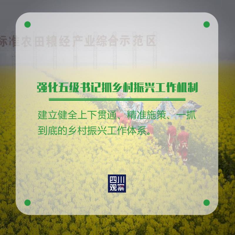 (四十)健全乡村振兴考核落实机制。各市(州)党委、政府每年向省委、省政府报告实施乡村振兴战略进展情况。严格落实《四川省市县党政和省直部门(单位)领导班子领导干部推进乡村振兴战略实绩考核办法(试行)》,加强考核结果运用。强化乡村振兴督查,创新完善督查方式,推进政策措施落地落实。健全“三农”统计调查体系,开展乡村振兴进展情况监测评估。稳步推进反映全产业链价值的农业及相关产业统计核算。