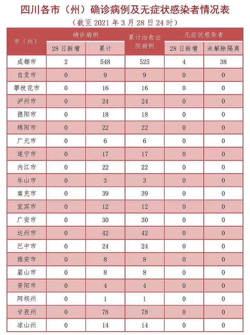 3月28日0-24时,四川新增新型冠状病毒肺炎确诊病例2例(境外输入,均为3月27日无症状感染者转确诊),无新增治愈出院病例,无新增疑似病例,无新增死亡病例。