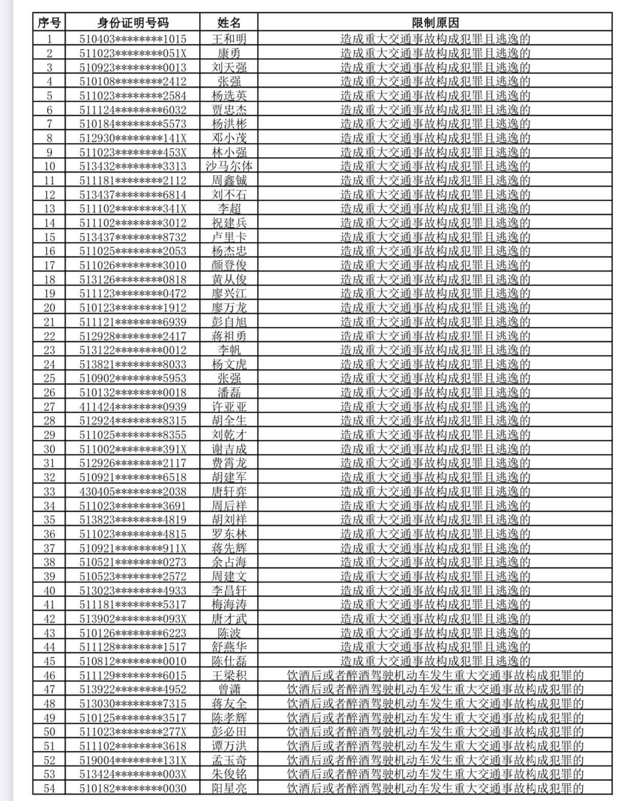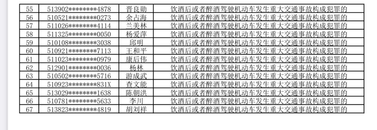 时间:2021-04-16 20:03:00 来源:四川观察4月16日,四川省公安厅交警总队向社会集中曝光了2021年3月被终生禁驾的67名驾驶人名单,其中造成重大交通事故构成犯罪且逃逸的45人;饮酒后或者醉酒驾驶机动车发生重大交通事故构成犯罪的22人。67名驾驶人中,年龄最大的63岁,年龄最小的24岁。
