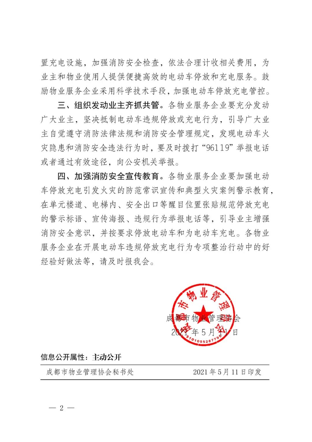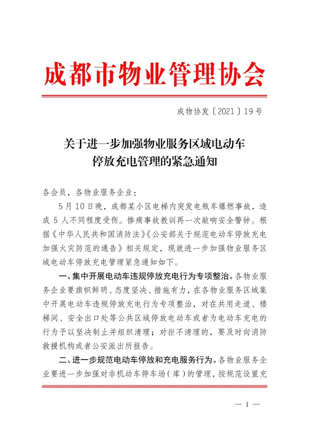 5月11日,成都市物业管理协会发布《关于进一步加强物业服务区域电动车停放充电管理的紧急通知》,详情如下: