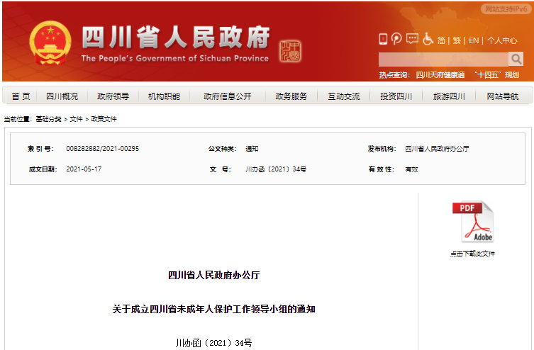 时间:2021-05-18 07:54:16 来源:四川观察记者5月17日从四川省政府官网获悉,17日,省政府办公厅发布通知,成立四川省未成年人保护工作领导小组,不再保留四川省儿童关爱保护保障工作联席会议。