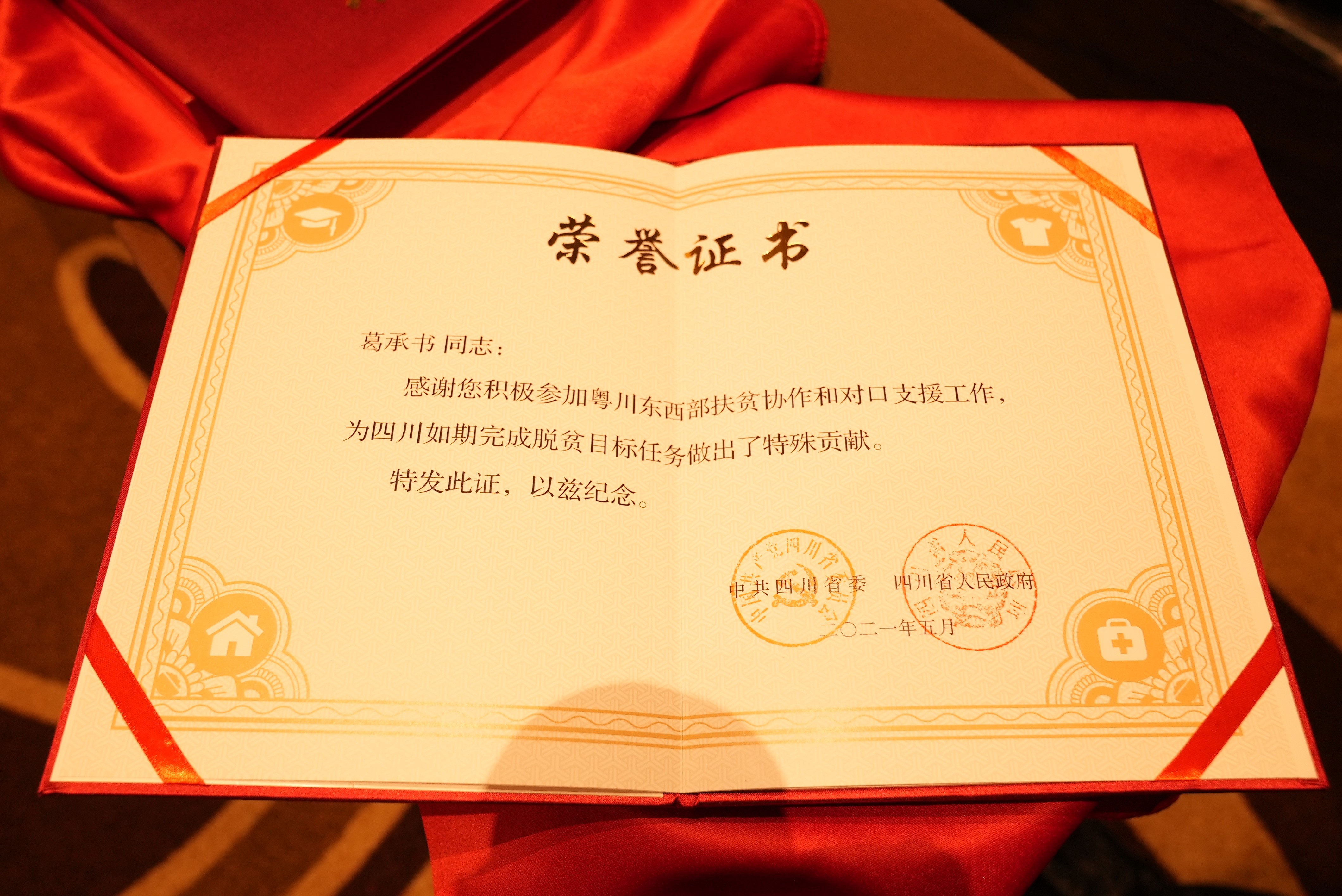 荣誉证书以四川省委省政府名义发出,感谢广东援川扶贫干部从教育、生活、住房、医疗各个领域,积极参与粤川东西扶贫协作和对口支援工作,为四川如期完成脱贫攻坚目标任务作出了特殊贡献。