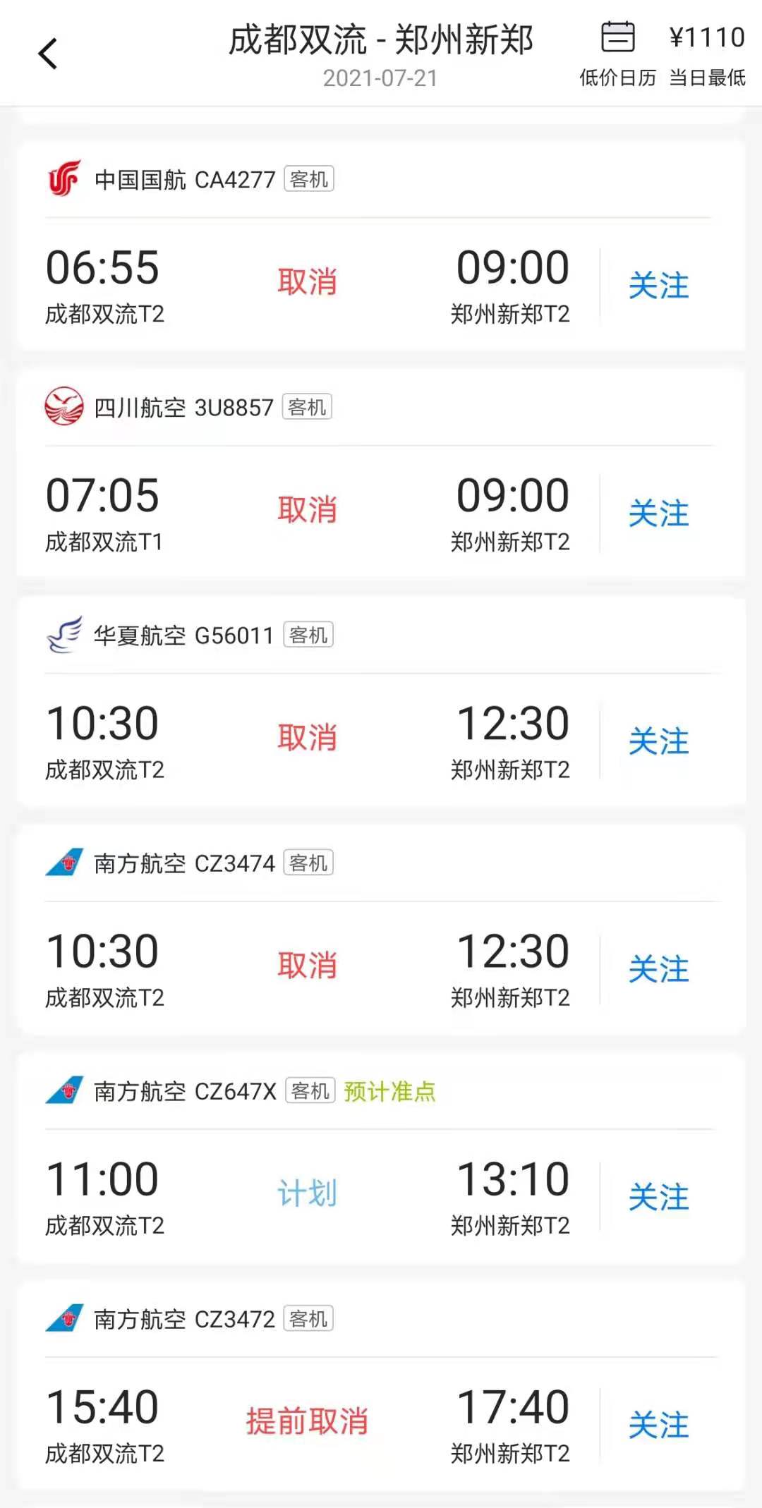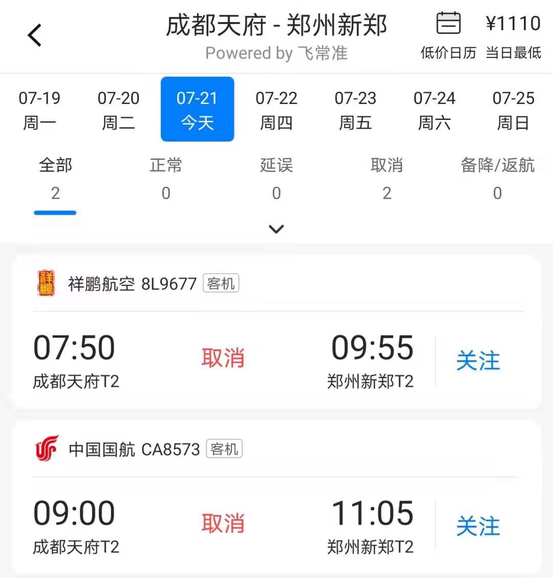 计划飞往郑州新郑有川航一个航班,已取消。