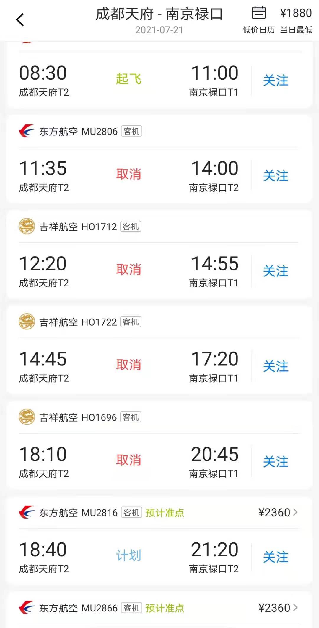计划飞往郑州新郑有东航一个航班,显示还在计划中;计划飞往南京禄口有东航一个航班,已取消。