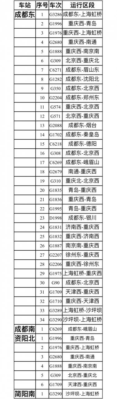 其他停运车次:G2211、G349、G89、G2089、G2090、G2087、G1284、G1281、C6271、C6272、G1283、G3288、G3287、C6270、G307、G1997、G1998、G1974、G1973、G2681、G2682、G2679、G1886、G1885、G1830、G1829、G1838、G1837、G1703、G1704、G1701、G6215、G3283、C3734、C3735、C3708、C3705、G3284、G3285、G6717、G6702、D1996、D1997、G 1536、G1535、G82、G1571、G1572、G401、G403、G2690、G2687、G2688、G2689、G466、G467、G468、G465、G405、G404、G402、K245、K248、K290、K291、K117、K15、K507、K817、K4363、K257、K4388、K4385、K2288、K2285、Z161、Z49、K1157、K1156、Z149、K635、K638