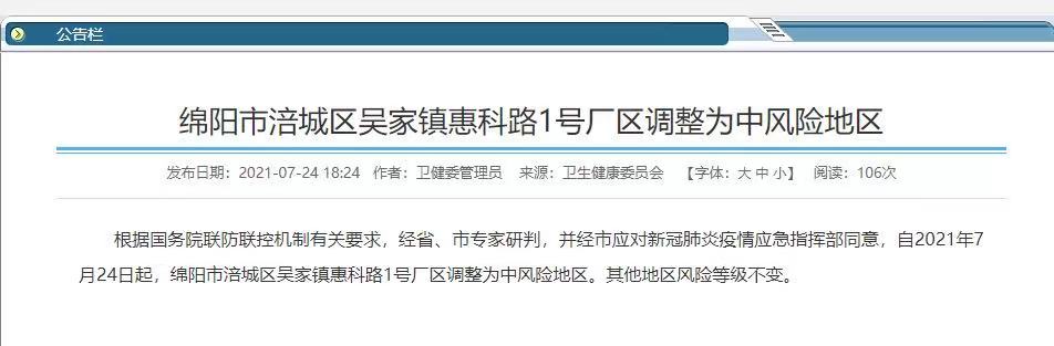 据绵阳卫健委官网消息:根据国务院联防联控机制有关要求,经省、市专家研判,并经市应对新冠肺炎疫情应急指挥部同意,自2021年7月24日起,绵阳市涪城区吴家镇惠科路1号厂区调整为中风险地区。其他地区风险等级不变。
