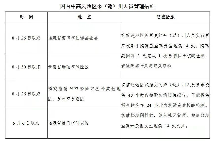 二、8月26日以来有福建省旅居史的来(返)川人员、所有健康码“红码”和“黄码”人员均需第一时间主动向所在社区、工作单位或所住酒店报备,配合做好各项防控措施;
