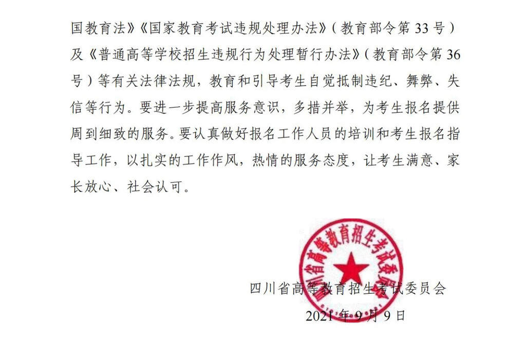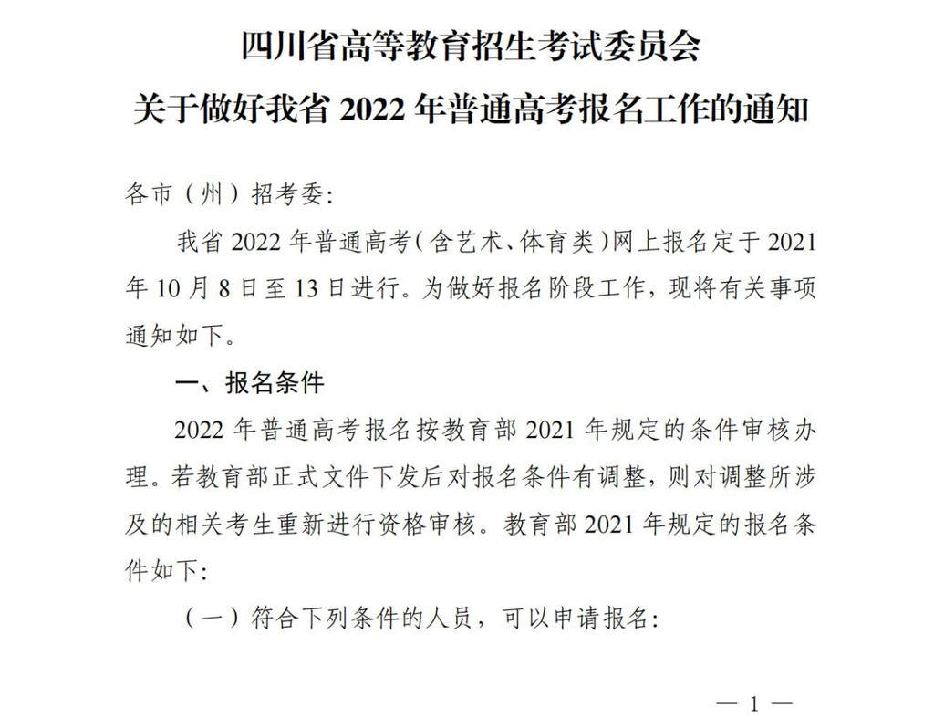 9月14日,记者从省教育考试院获悉,四川2022年普通高考(含艺术、体育类)网上报名定于10月8日至13日进行,详情如下: