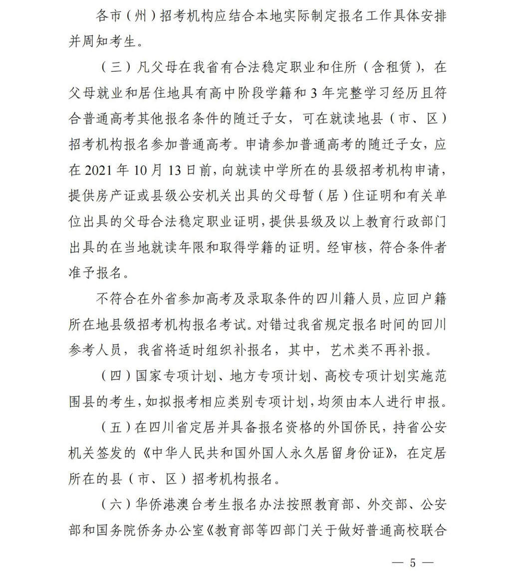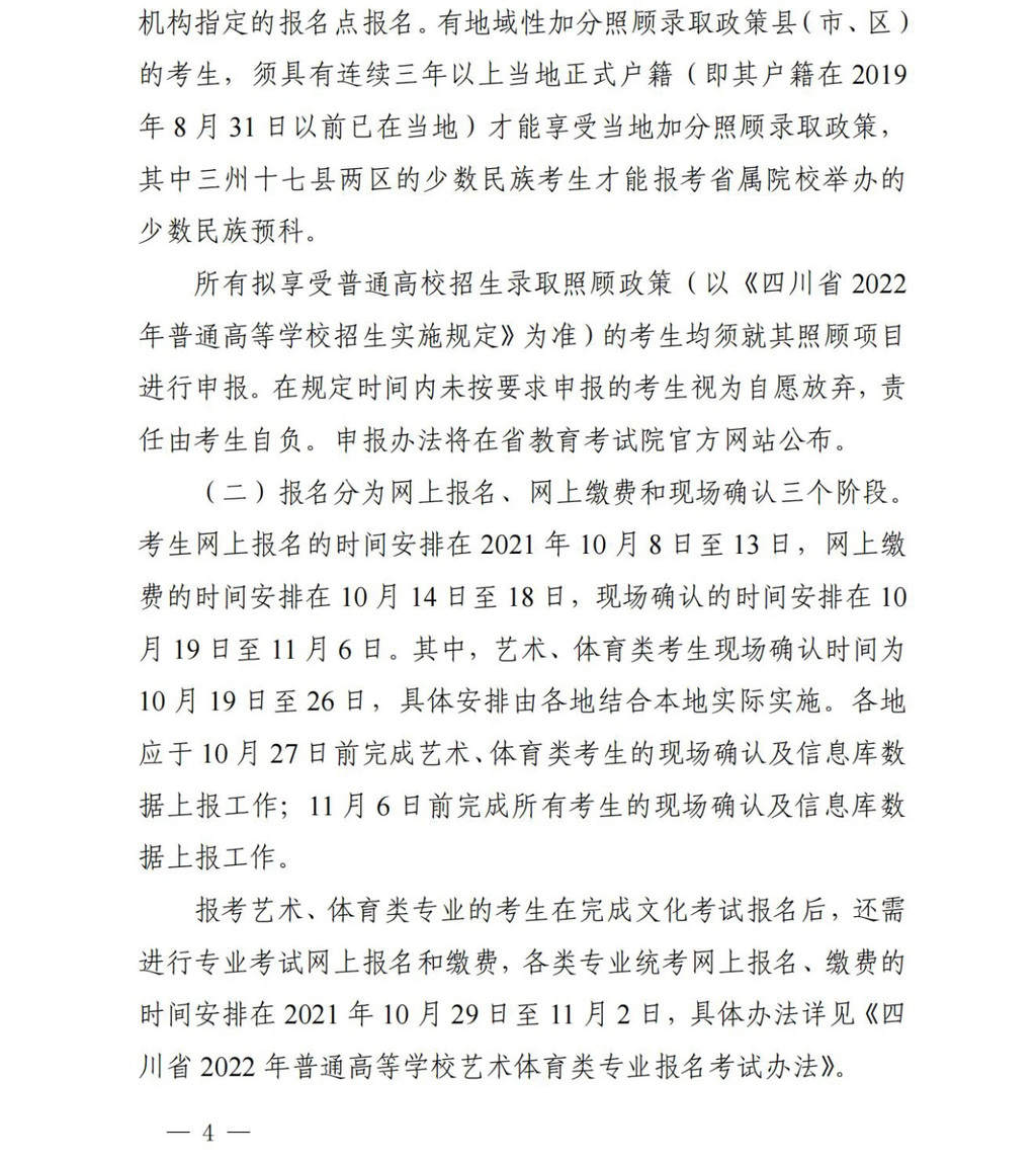 时间:2021-09-14 18:11:41 来源:川观新闻9月14日,记者从省教育考试院获悉,四川2022年普通高考(含艺术、体育类)网上报名定于10月8日至13日进行,详情如下: