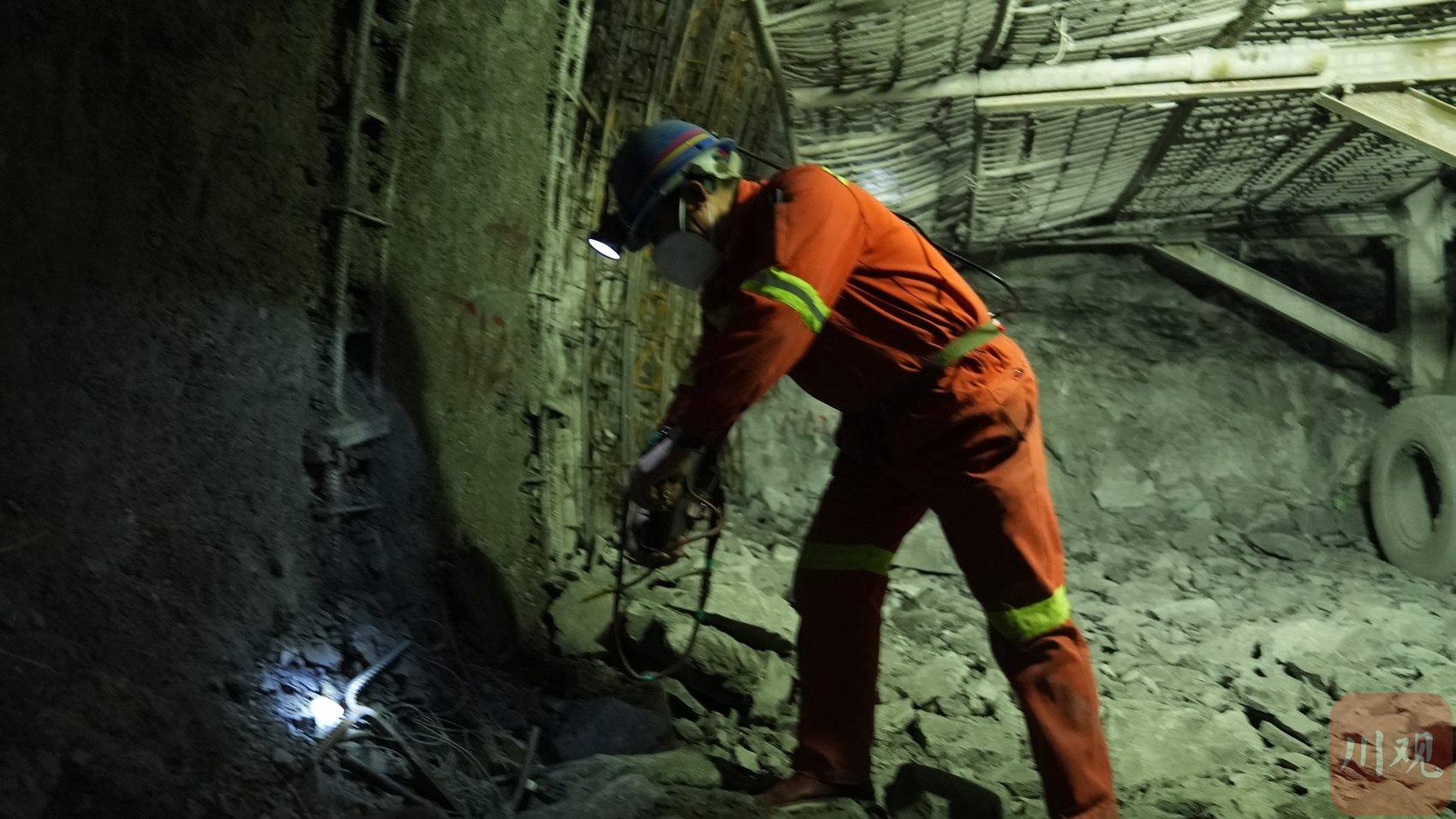 说话间,一辆挖掘机搭载着弧形的连接筋前来,几名工人上前抬起连接筋,放置到台车底部。台车顶部,在技术人员的指导下,连接筋拼接成型,电焊工开始工作,火花从高处滚落,分外好看。身穿红色制服的瓦检员赵德裕站在旁边,一直监测记录着异常气体的数值。